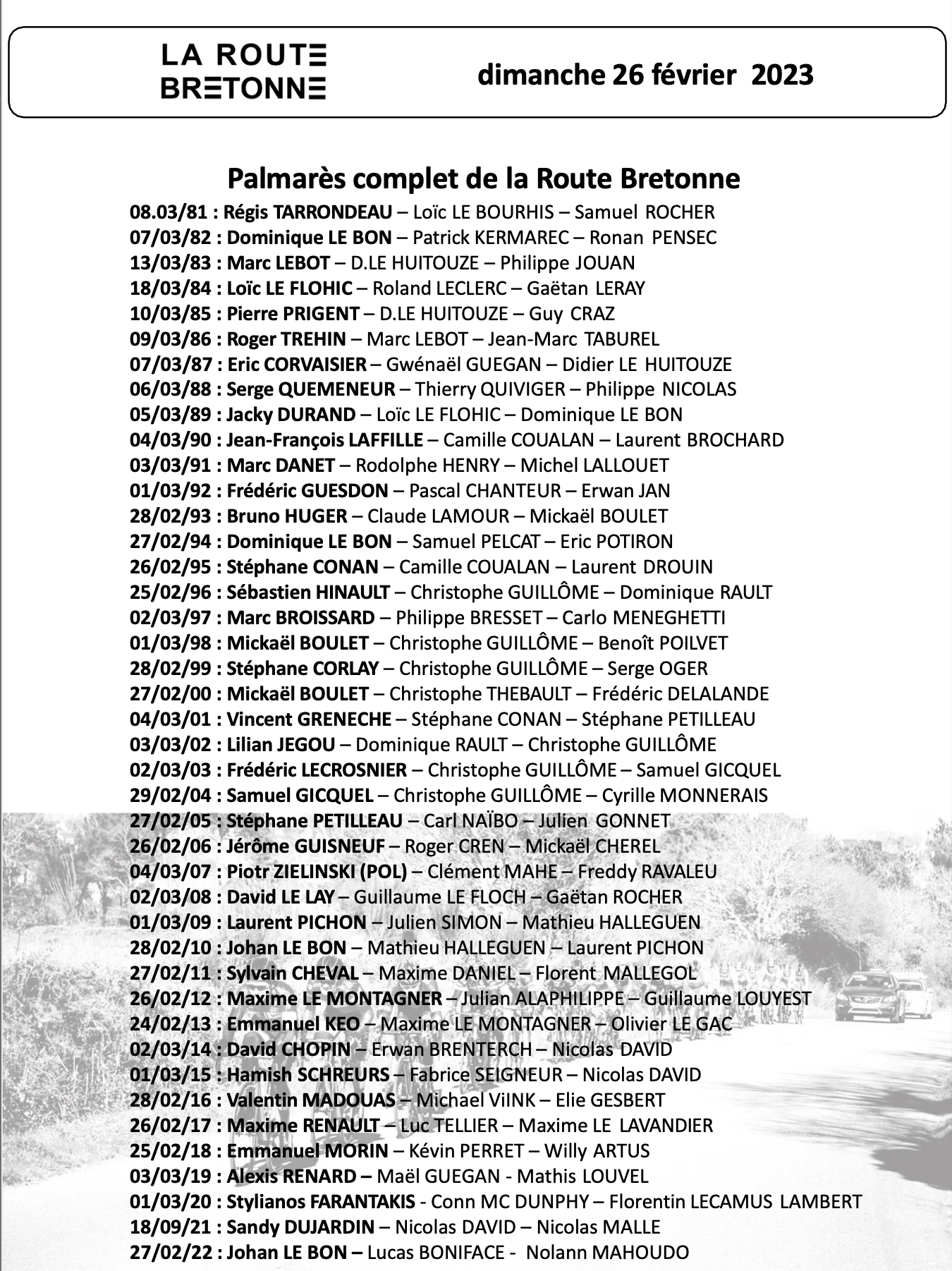 Dans le programme distribué sur le circuit de Lesnevé, vous trouverez la liste de tous les coureurs avec leurs numéros de dossards.